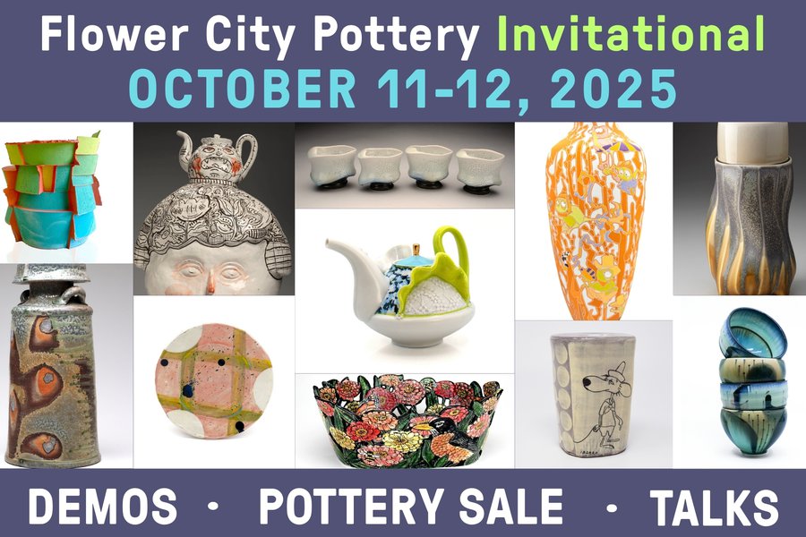 Flower City Arts Center is thrilled to present its ninth Flower City Pottery Invitational, a three-day affair that features a show and sale, demos and talks from national artists in ceramics. Since its inauguration in 2015, the invitational has presented dozens of carefully curated artists from around the country, offering collectors and clay lovers the opportunity to view new-to-them talents and add to their collections. This year’s exhibition opens on Friday, Oct. 10 and features 19 artists working in a wide variety of styles and techniques, with vessels and decorative art objects to fit every taste available for purchase. SATURDAY 10-5PM SUNDAY 11-4PM The event includes: