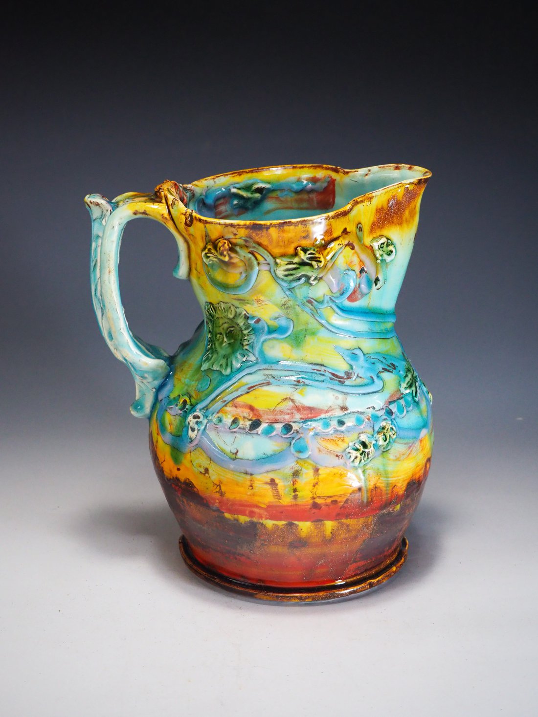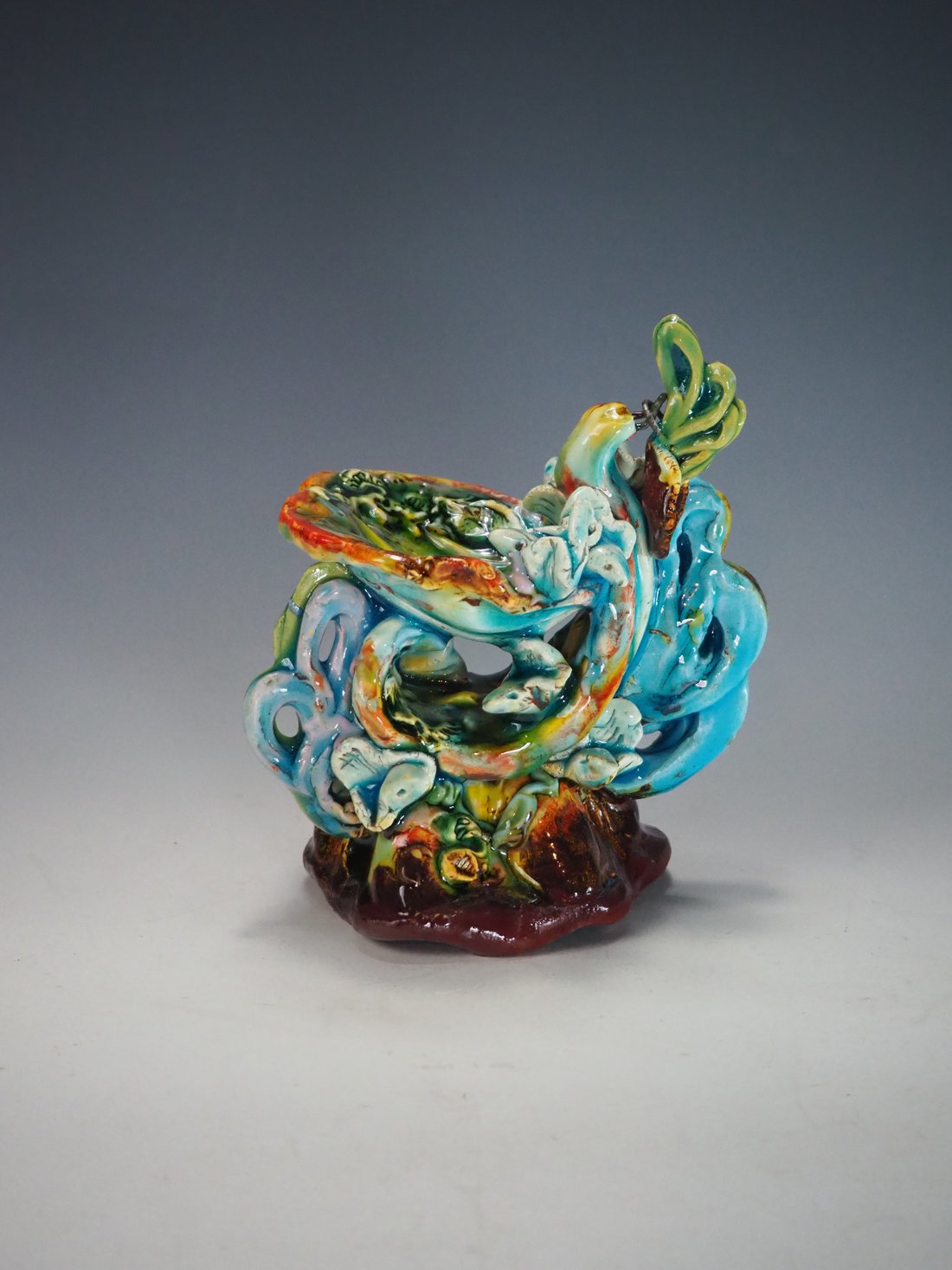My artworks for the table refer to traditional porcelain or restaurant whitewares, but with softer forms inspired by the playful and abundant qualities of Mexican earthenware. I invented my own production process after studying clay mold fragments in antiquated factories and museums. After forming pieces in molds, on the wheel, or both, I finish with gestural animals, stamps, slips, sprigs and multihued glazes. To some, my jeweltone glaze colors evoke a healthy garden in bloom or an underwater seascape. My colors, textures and strength of my forms set my work apart; my forms are muscular and strong but also fluid. I engage both ends of the spectrum, from the dynamic and substantive to the detailed and dreamy—I celebrate tiny surprises in my work. My colorful, shapely earthenware looks best holding a freshly prepared meal on the table.