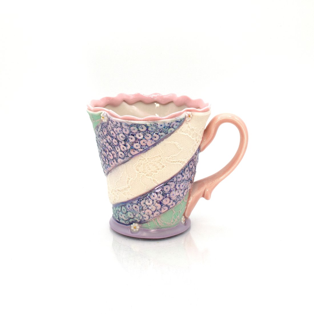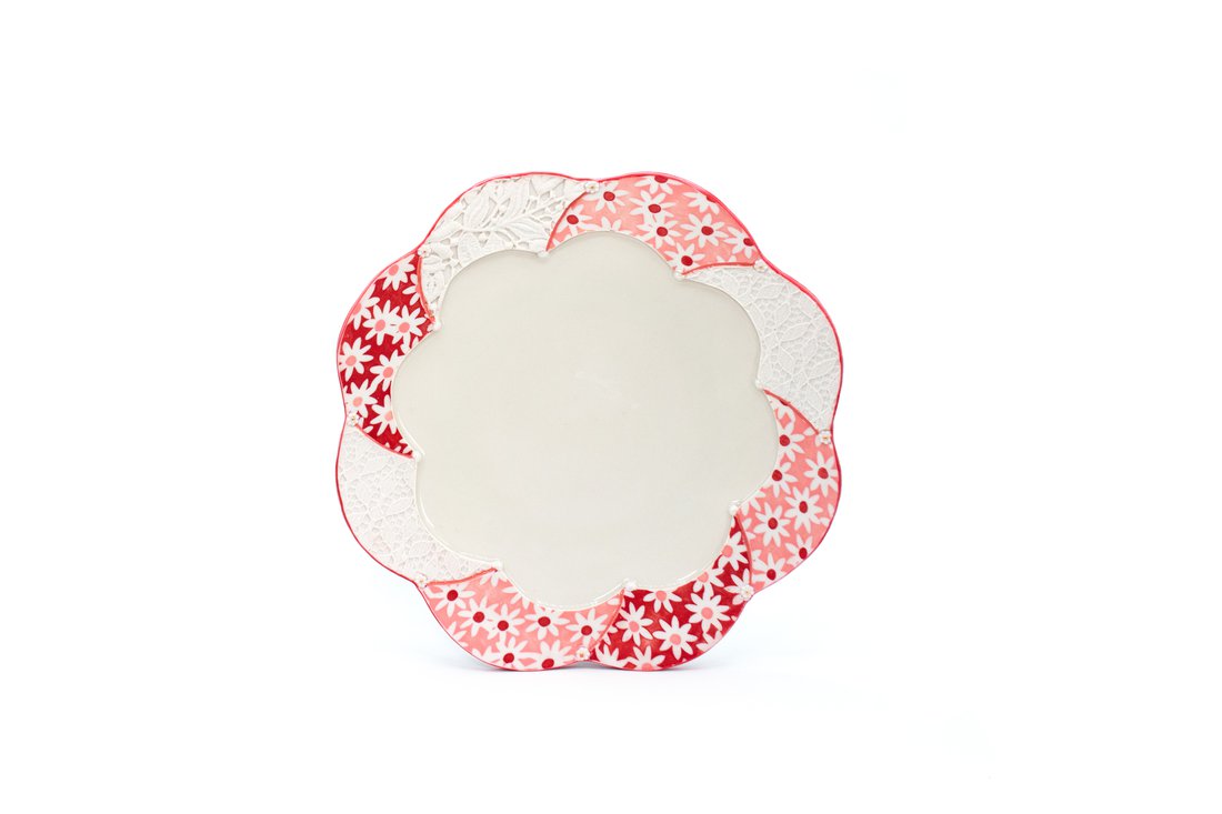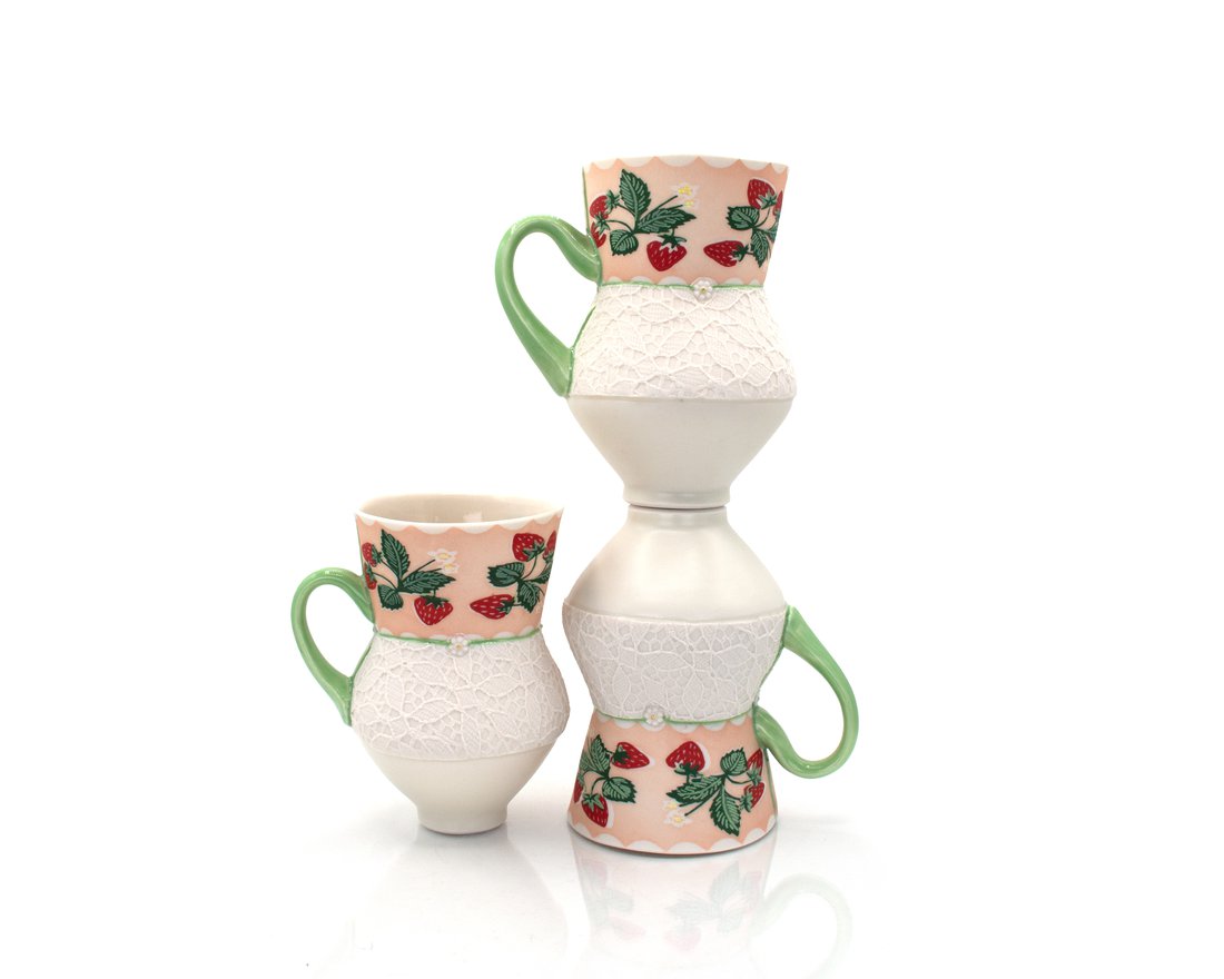 I use the shared language of the body and vessel to explore the emotional and cultural landscapes of clothing. My functional porcelain pieces draw from garment-making and feature patterns and textures from my wardrobe—objects tied to comfort, beauty, and memory. Using screenprinting, monoprinting, and digital design, I create layered imagery on porcelain slabs that I construct into utilitarian forms by combining wheel throwing and handbuilding techniques. This practice reflects a lifelong, complex relationship with my body and the tension between self-acceptance and societal expectations. Clothing holds ambiguous power—both connective and exclusionary. Seams become metaphors for relationships: between textures, materials, bodies, and people. By working with porcelain “fabric,” I reconstruct moments of connection and disconnection, imprinting them into vessels that invite touch, reflection, and nourishment. These pieces offer reclaimed comfort and elevate everyday rituals—holding space for beauty, transformation, and embodied experience.